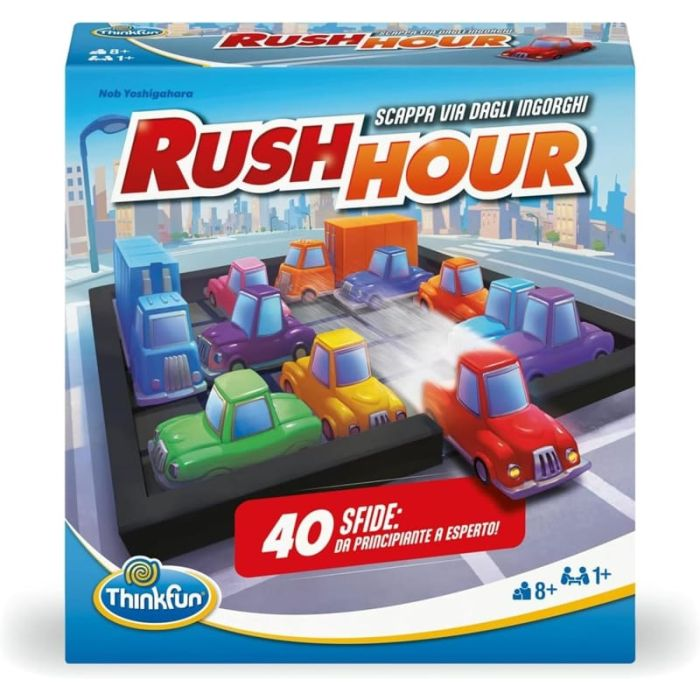 In Rush Hour avrete 4 livelli da superare (da Principiante a Esperto), sembra facile, ma per arrivare alla fine ci vuole molta pazienza. Infatti è un gioco di intelligenza ed abilità, adatto sia a grandi che a piccini! I giocatori devono piazzare le macchine e i camion sulla griglia di gioco in base a come sono posizionate le macchine sulle schede. Lo scopo del gioco è quello di far uscire dall'ingorgo la macchina rossa. Le soluzioni e un porta schede sono incluse nel gioco.